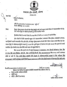 ਮੁੱਖ ਮੰਤਰੀ ਦਫ਼ਤਰ ਵੱਲੋਂ ਜਾਰੀ ਪੱਤਰ ਅਨੁਸਾਰ, ਇਹ 20 ਲੱਖ ਰੁਪਏ ਦੀ ਰਾਸ਼ੀ ਡਿਪਟੀ ਕਮਿਸ਼ਨਰ, ਮੋਗਾ ਦੇ ਬੈਂਕ ਖਾਤੇ ਵਿੱਚ RTGS ਰਾਹੀਂ ਟ੍ਰਾਂਸਫਰ ਕੀਤੀ ਜਾ ਰਹੀ ਹੈ।