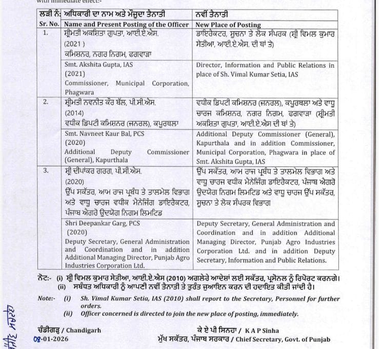 ਪੰਜਾਬ ਸਰਕਾਰ ਵੱਲੋਂ 3 IAS ਅਤੇ PCS ਅਫ਼ਸਰਾਂ ਦਾ ਤਬਾਦਲਾ, ਪੜ੍ਹੋ ਲਿਸਟ All Latest NewsNews FlashPunjab NewsTop BreakingTOP STORIES January 8, 2026 Media PBN Staff ਪੰਜਾਬ ਸਰਕਾਰ ਵੱਲੋਂ 3 IAS ਅਤੇ PCS ਅਫ਼ਸਰਾਂ ਦਾ ਤਬਾਦਲਾ, ਪੜ੍ਹੋ ਲਿਸਟ Media PBN ਚੰਡੀਗੜ੍ਹ, 8 ਜਨਵਰੀ 2026- ਪੰਜਾਬ ਸਰਕਾਰ ਵੱਲੋਂ ਸੂਬੇ ਦੇ ਤਿੰਨ ਸੀਨੀਅਰ ਆਈਏਐਸ ਅਤੇ ਪੀਸੀਐਸ ਅਫਸਰਾਂ ਦਾ ਤਬਾਦਲਾ ਕੀਤਾ ਗਿਆ ਹੈ। ਹੇਠਾਂ ਪੜ੍ਹੋ ਲਿਸਟ