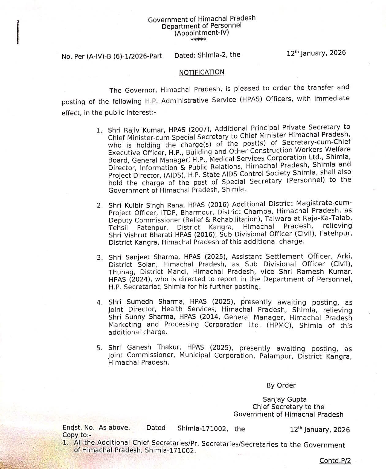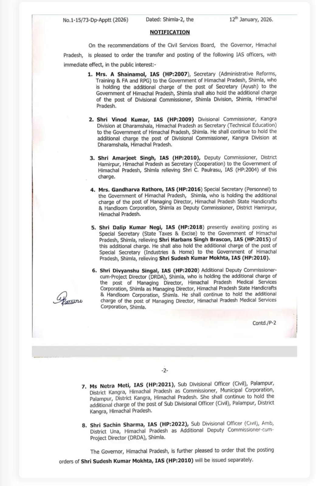 ਚੰਡੀਗੜ੍ਹ, 13 ਜਨਵਰੀ 2026- ਹਿਮਾਚਲ ਪ੍ਰਦੇਸ਼ ਸਰਕਾਰ ਦੇ ਵੱਲੋਂ 13 IAS ਅਤੇ HPAS ਅਫ਼ਸਰਾਂ ਦਾ ਤਬਾਦਲਾ ਕੀਤਾ ਗਿਆ ਹੈ। ਤਬਾਦਲਿਆਂ ਦੀ ਇਸ ਲਿਸਟ ਦੇ ਵਿੱਚ ਇੱਕ ਡੀਸੀ ਵੀ ਸ਼ਾਮਲ ਹੈ, ਜਿਸ ਦੀ ਬਦਲੀ ਕੀਤੀ ਗਈ ਹੈ।