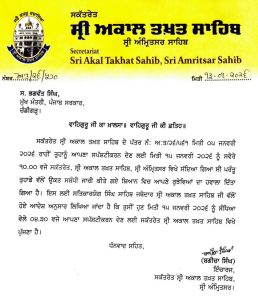 ਸ੍ਰੀ ਅੰਮ੍ਰਿਤਸਰ, 13 ਜਨਵਰੀ 2026- ਸ੍ਰੀ ਅਕਾਲ ਤਖ਼ਤ ਸਾਹਿਬ ਦੇ ਕਾਰਜਕਾਰੀ ਜਥੇਦਾਰ ਸਿੰਘ ਸਾਹਿਬ ਗਿਆਨੀ ਕੁਲਦੀਪ ਸਿੰਘ ਗੜਗੱਜ ਦੇ ਆਦੇਸ਼ ਅਨੁਸਾਰ ਮਿਤੀ 15 ਜਨਵਰੀ 2026 ਨੂੰ ਪੰਜਾਬ ਦੇ ਮੁੱਖ ਮੰਤਰੀ ਭਗਵੰਤ ਸਿੰਘ ਦਾ ਸਕੱਤਰੇਤ ਸ੍ਰੀ ਅਕਾਲ ਤਖ਼ਤ ਸਾਹਿਬ ਵਿਖੇ ਆਪਣਾ ਸਪੱਸ਼ਟੀਕਰਨ ਦੇਣ ਦਾ ਸਮਾਂ ਉਨ੍ਹਾਂ ਵੱਲੋਂ ਉਸ ਦਿਨ ਦੇ ਦਰਸਾਏ ਗਏ ਆਪਣੇ ਰੁਝੇਵਿਆਂ ਦੇ ਮੱਦੇਨਜ਼ਰ ਸਵੇਰੇ 10 ਵਜੇ ਤੋਂ ਬਦਲ ਕੇ ਹੁਣ ਸੰਧਿਆ ਵੇਲੇ 04:30 ਵਜੇ ਦਾ ਕਰ ਦਿੱਤਾ ਗਿਆ ਹੈ।