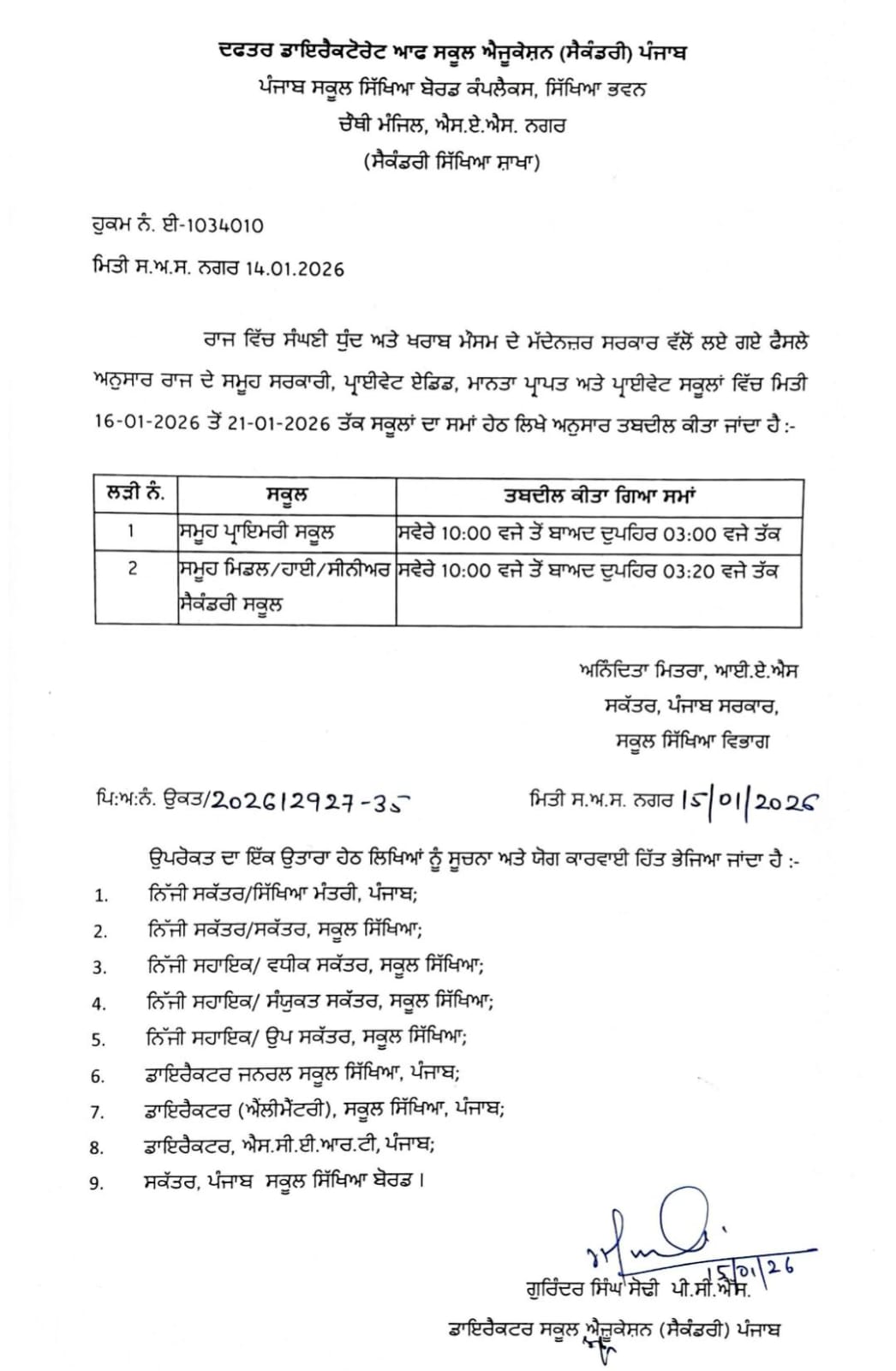 ਇਸੇ ਤਰ੍ਹਾਂ ਹੀ ਮਿਡਲ ਹਾਈ ਅਤੇ ਸੀਨੀਅਰ ਸੈਕੰਡਰੀ ਸਕੂਲ ਸਵੇਰੇ 10 ਵਜੇ ਲੱਗਿਆ ਕਰਨਗੇ, ਜਦੋਂ ਕਿ ਇਹਨਾਂ ਸਕੂਲਾਂ ਵਿੱਚ 3 ਵੱਜ ਕੇ 20 ਮਿੰਟ ਤੇ ਛੁੱਟੀ ਹੋਇਆ ਕਰੇਗੀ।
