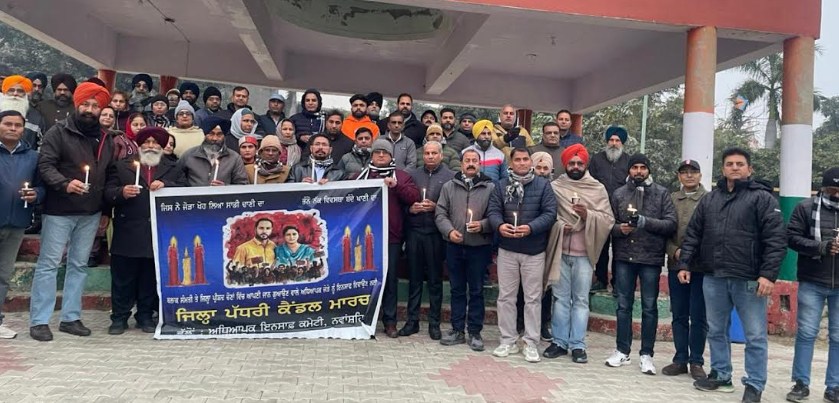 ਸ਼ਹੀਦ ਭਗਤ ਸਿੰਘ ਨਗਰ ਜਿਲ੍ਹੇ ਦੀਆਂ ਸਮੂਹ ਅਧਿਆਪਕ ਜਥੇਬੰਦੀਆਂ ਵੱਲੋਂ ਜਿਲ੍ਹਾ ਪਰਿਸ਼ਦ ਅਤੇ ਬਲਾਕ ਸੰਮਤੀ ਚੋਣ ਡਿਊਟੀ ਦੌਰਾਨ ਮੋਗਾ ਵਿਖੇ ਜਾਨ ਗਵਾਉਣ ਵਾਲੇ ਅਧਿਆਪਕ ਜੋੜੇ ਨੂੰ ਇਨਸਾਫ ਦੁਆਉਣ ਲਈ ਸਥਾਨਕ ਬਾਰਾਂਦਰੀ ਗਾਰਡਨ ਤੋਂ ਫੱਟੀ ਬਸਤਾ ਚੌਕ ਤੋਂ ਹੁੰਦੇ ਹੋਏ ਬੱਸ ਸਟੈਂਡ ਚੌਂਕ ਨੇੜੇ ਡਾਕਟਰ ਭੀਮ ਰਾਓ ਅੰਬੇਡਕਰ ਦੇ ਬੁੱਤ ਤੱਕ ਕੈਂਡਲ ਮਾਰਚ ਕੀਤਾ ਗਿਆ, ਜਿਸ ਵਿੱਚ ਜਿਲ੍ਹੇ ਵਿੱਚੋਂ ਵੱਡੀ ਗਿਣਤੀ ਅਧਿਆਪਕਾਂ ਅਤੇ ਭਰਾਤਰੀ ਜਥੇਬੰਦੀਆਂ ਨੇ ਭਾਗ ਲਿਆ।