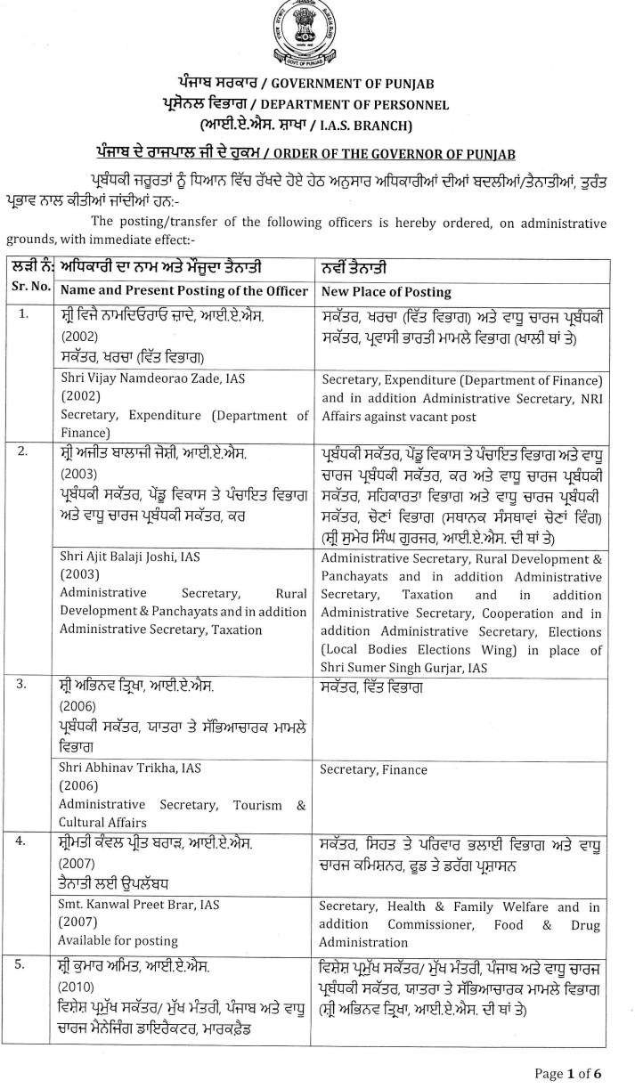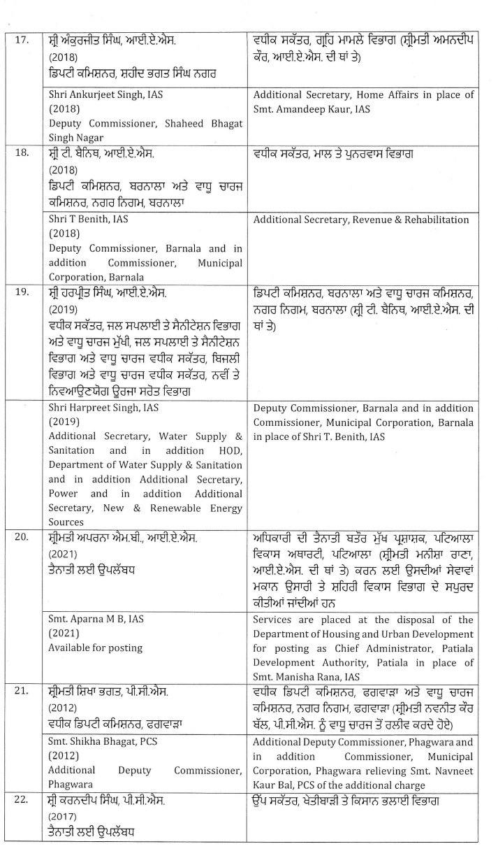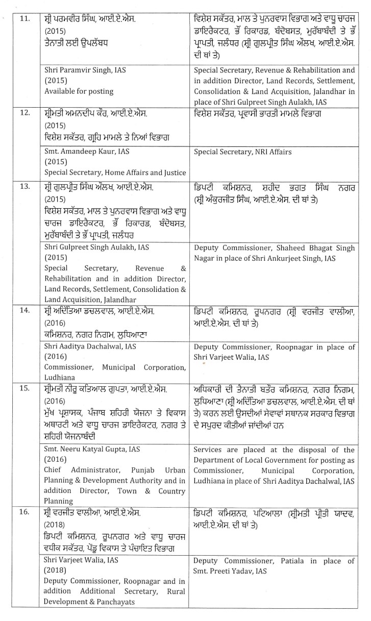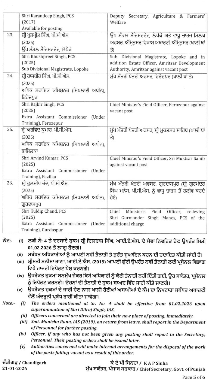 ਵੱਡੀ ਖ਼ਬਰ: ਪੰਜਾਬ ਸਰਕਾਰ ਵੱਲੋਂ 26 IAS ਅਤੇ PCS ਅਫ਼ਸਰਾਂ ਦਾ ਤਬਾਦਲਾ, ਪੜ੍ਹੋ ਲਿਸਟ All Latest NewsNews FlashPunjab NewsTop BreakingTOP STORIES January 21, 2026 Media PBN Staff ਵੱਡੀ ਖ਼ਬਰ: ਪੰਜਾਬ ਸਰਕਾਰ ਵੱਲੋਂ 26 IAS ਅਤੇ PCS ਅਫ਼ਸਰਾਂ ਦਾ ਤਬਾਦਲਾ, ਪੜ੍ਹੋ ਲਿਸਟ ਚੰਡੀਗੜ੍ਹ, 21 ਜਨਵਰੀ 2026- ਪੰਜਾਬ ਸਰਕਾਰ ਦੇ ਵੱਲੋਂ 26 ਆਈਏਐਸ ਅਤੇ ਪੀਸੀਐਸ ਅਫ਼ਸਰਾਂ ਦਾ ਤਬਾਦਲਾ ਕੀਤਾ ਗਿਆ ਹੈ। ਹੇਠਾਂ ਪੜ੍ਹੋ ਲਿਸਟ